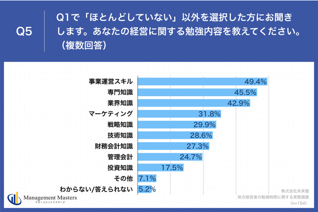 Q1で「ほとんどしていない」以外を選択した方に、「Q5.あなたの経営に関する勉強内容を教えてください。(複数回答)」(n=154)と質問したところ、「事業運営スキル」が49.4%、「専門知識」が45.5%、「業界知識」が42.9%という回答となりました。