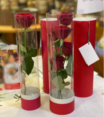『らぶはな』は、レストランその他飲食店にラッピングチューブ入りの花をデリバリーするサービスです。ラッピングチューブに梱包されるので、二輪車でのデリバリーに適しています。フードデリバリー用のバッグに収容可能です。スマートフォンから飲食店を選択すれば食事の席に花が届けられます。紙筒で目隠しされるので「プレゼントを開ける」サプライズ感が確保されます。届けられた花はそのままテーブルを飾ります。花束よりも簡単に持ち帰りできます。自宅の部屋でも花瓶いらずで飾れます。[特許取得済 特許第6913918号ほか]