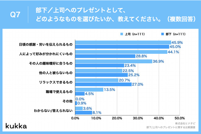 「Q7.部下/上司へのプレゼントとして、どのようなものを選びたいか、教えてください。(複数回答)」と質問したところ、上司(n=111)は「日頃の感謝・労いを伝えられるもの」が45.9%、「人によって好みが分かれにくいもの」が44.1%、「その人の趣味嗜好に合うもの」が36.9%、部下(n=111)は「日頃の感謝・労いを伝えられるもの」が45.0%、「人によって好みが分かれにくいもの」が28.8%、「リラックスできるもの」が27.0%という回答となりました。