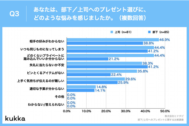 Q2で「かなりある」「ややある」と回答した方に、「Q3.あなたは、部下/上司へのプレゼント選びに、どのような悩みを感じましたか。(複数回答)」と質問したところ、上司(n=81)は「相手の好みがわからない」が46.9%、「いつも同じものになってしまう」が44.4%、「どのくらいプライベートに踏み込んでいいか分からない」が44.4%、部下(n=85)は「いつも同じものになってしまう」が41.2%、「失礼に当たらないか不安」が41.2%、「相手の好みがわからない」が38.8%という回答となりました。