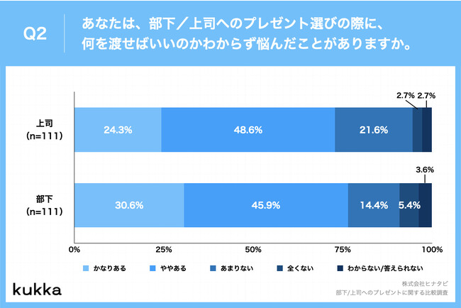 「Q2.あなたは、部下/上司へのプレゼント選びの際に、何を渡せばいいのかわからず悩んだことがありますか。」と質問したところ、上司(n=111)は「かなりある」が24.3%、「ややある」が48.6%、部下(n=111)は「かなりある」が30.6%、「ややある」が45.9%という回答となりました。