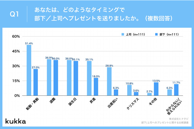 「Q1.あなたは、どのようなタイミングで部下/上司へプレゼントを送りましたか。(複数回答)」と質問したところ、上司(n=111)は「転勤・異動」が51.4%、「退職」が36.9%、「誕生日」が36.0%、部下(n=111)は「退職」が36.0%、「誕生日」が35.1%、「転勤・異動」が27.0%という回答となりました。