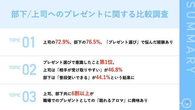 まず、上司が部下にプレゼントする場合、「転勤・異動」のタイミングが最多となり、部下が上司にプレゼントする場合は、「退職」や「誕生日」のタイミングが最多となりました。プレゼントを選ぶ際に、全体の7割以上が悩んだ経験があり、「部下の好みがわからない」、「上司へのプレゼントがいつも同じものになってしまう」など、相手が喜ぶものを選ぶことに苦戦している様子が伝わってくる内容となりました。また、プレゼント選びで意識したことに関しては、上司は「相手が受け取りやすい」が46.8%、部下は「普段使いできる」が44.1%で最多となった他、上司・部下ともに「日頃の感謝・労いを伝えられるもの」を選ぶ傾向が強いことが分かりました。最後に、睡眠のお悩みのために開発された眠れるアロマについてご紹介したところ、全体の6割以上が「プレゼントとして興味がある」と回答しました。