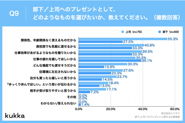 Q8で「非常に興味がある」「やや興味がある」と回答した方に、「Q9.あなたが、眠れるアロマに興味がある理由を教えてください。(複数回答)」と質問したところ、上司(n=76)は「関係性、年齢関係なく使えるものだから」が55.3%、「異性間でも気軽に渡せるから」が40.8%、「仕事効率があがるようなものを贈りたいから」が39.5%、部下(n=69)は「仕事の疲れを癒してほしいから」が39.1%、「仕事効率があがるようなものを贈りたいから」が33.3%、「異性間でも気軽に渡せるから」が33.3%という回答となりました。