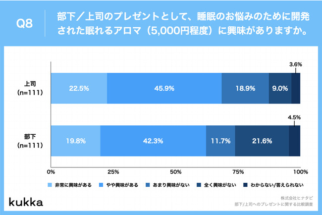 「Q8.部下/上司のプレゼントとして、睡眠のお悩みのために開発された眠れるアロマ(5,000円程度)に興味がありますか。」と質問したところ、上司(n=111)は「非常に興味がある」が22.5%、「やや興味がある」が45.9%、部下(n=111)は「非常に興味がある」が19.8%、「やや興味がある」が42.3%という回答となりました。
