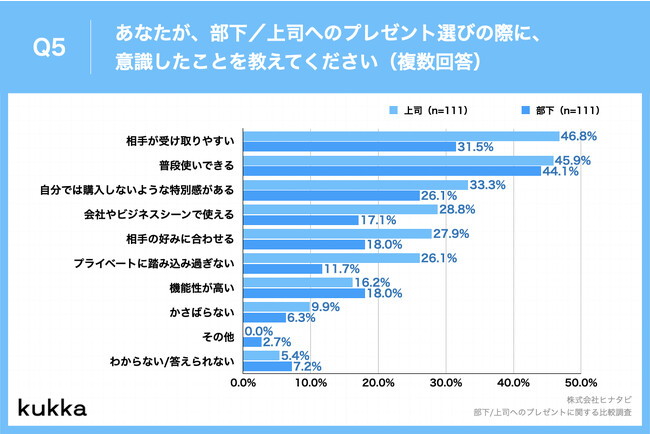 「Q5.あなたが、部下/上司へのプレゼント選びの際に、意識したことを教えてください。(複数回答)」と質問したところ、上司(n=111)は「相手が受け取りやすい」が46.8%、「普段使いできる」が45.9%、「自分では購入しないような特別感がある」が33.3%、部下(n=111)は「普段使いできる」が44.1%、「相手が受け取りやすい」が31.5%、「自分では購入しないような特別感がある」が26.1%という回答となりました。