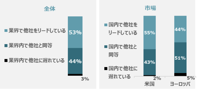 自分の組織がAI導入で遅れていると感じている人は少ないが、ビジネスリーダーにおいては自分の組織が同業他社より進んでいると回答した人は53%、同業他社と互角と回答した人も同様に44%であるという結果でした。