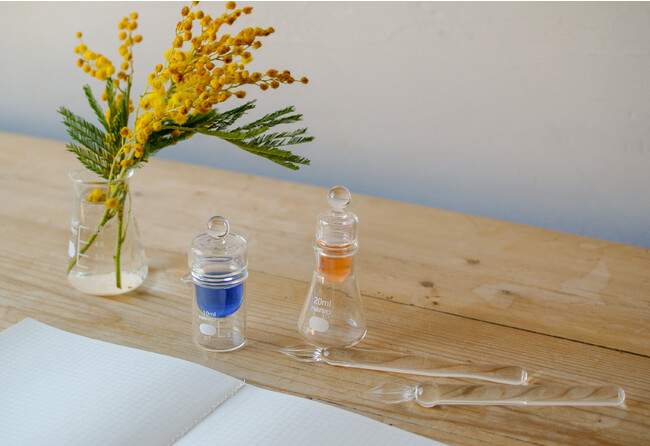 誰もが授業で1度は触れたことがあるビーカーと三角フラスコの印影で実験気分を味わえます。