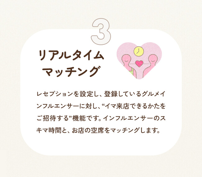 飲食店は3つのマッチング機能から希望の機能を選び、マッチングされたグルメインフルエンサーが店舗を 訪れ、飲食店はグルメ体験を提供します。グルメ体験後、グルメインフルエンサーは自身のSNSで店舗の魅力を投稿し、飲食店とお客さまの新たな出会いにつなげます。“リアルタイムマッチング“は、お店の空席とグルメインフルエンサーのスキマ時間をリアルタイムでマッチングする新たな仕組みを導入した機能で、昨今社会的な課題として取り上げられる食品ロスにもアプローチしながら飲食店を応援できる「スマホひとつで、空席を招待席に。」を体現する機能となっています。