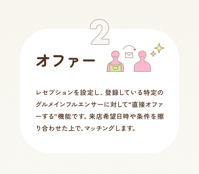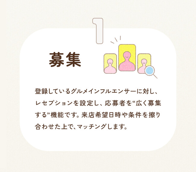 飲食店がグルメインフルエンサーに体験して欲しいおすすめのメニューなどで構成したグルメ体験を提供するレセプションを設定。設定したレセプションに対し、3つのマッチング機能を介してマッチングしたグルメインフルエンサーが、体験内容を自身のSNSで発信することでお店の魅力を伝えます。