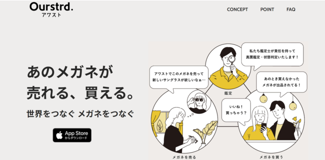 「Ourstrd.(アワスト)」とは、家に眠っているリユース&デッドストックの眼鏡・サングラスを気軽に売買し、購入者は提携眼鏡店で各種サービスを受けられるサービスで、既存のフリマアプリで出品されにくい、または専門家のサービスが必要で付加価値が生み出しにくいレアなアイウェアに特化したフリマアプリです。取引されるアイウェアは、必ずアワストサービスセンターで真贋鑑定・状態判定を行う為、レアなアイウェアも安心してお取引いただけます。