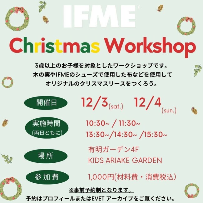 直営店のある有明ガーデンにて、12月3日(土)・12月4日(日)の2日間『IFMEクリスマスワークショップ』を開催いたします。