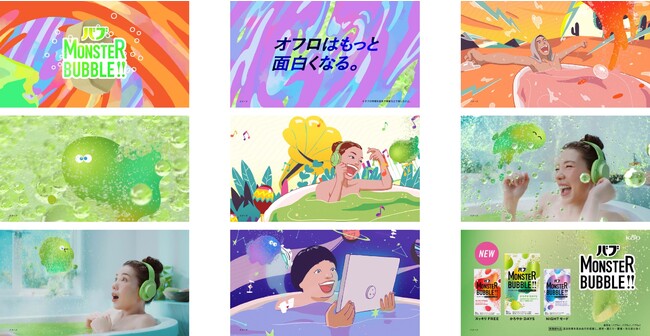 新TVCMでは、日頃から「入浴クリエイター」としてオフロ時間を楽しまれている、女優の仲里依紗さん、お笑い芸人のおかずクラブ オカリナさん、人気動画クリエイターおるたなChannelのないとーさんの3名がご出演。本CMでは、仲さんが湧きたつような炭酸のジェット発泡と共に踊りながら「ミュージック浴」を楽しむ姿を紹介。その他にも、オカリナさんのお休み前にゆったりと映像を楽しむ「シアター浴」、ないとーさんのスカっと汗をかきながらの「発汗大好き浴」など、3タイプの、『バブ MONSTER BUBBLE』と共にオフロ時間を楽しむそれぞれのスタイルにご注目ください。