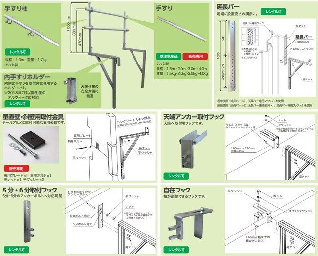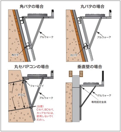 主要部材がアルミ製のため4.3kgと軽量でピンをさすだけで組み立てられ、48.6Φ単管や50角バタ・60角バタに取付可能です。フックを外せばコンクリート躯体に直接取り付けることもできます。