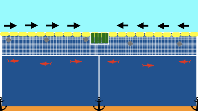 断面図。水面のみを網でカバーすることで浮いてくるプラごみを回収し、魚は逃げられる仕組みにする。