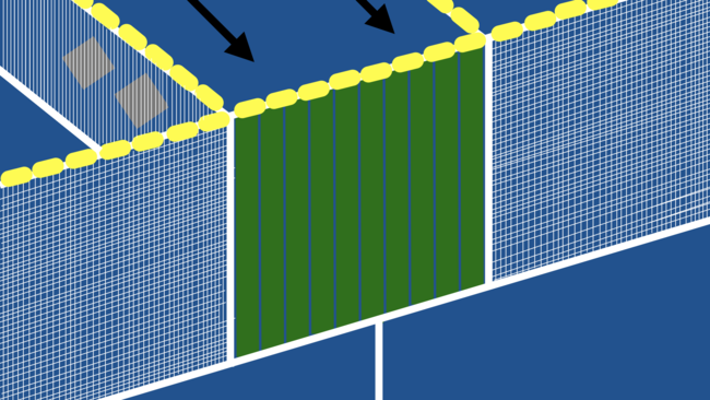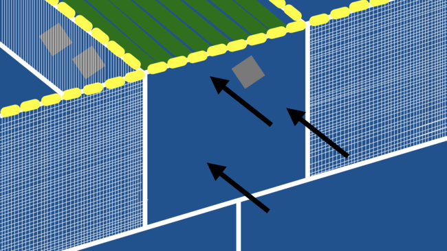 平面図。二号機ではIの字設置だったため、真ん中の回収ポケットに海洋ごみが入らなかった。Uの字設置に変えることで真ん中のポケットへ海洋ごみを誘導する。