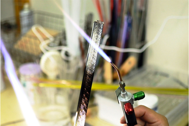 国内外のメーカーから様々な要望を50年以上実現してきたガラス製作のスペシャリスト竹内信夫氏により、難易度の高い「ファイヤーポリッシュ」を施し、デザインに合わせてペン軸をひねることで、唯一無二の輝きを持つ逸品が完成しました。