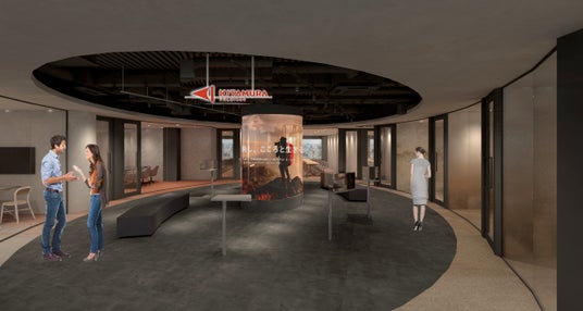 お客様をお招きするエントランスを、写真の「フィルム」をイメージした内装デザインとしながら、各会議室にはスマートディスプレイを配置し、テクノロジーとノスタルジーが重なる空間を演出しています。