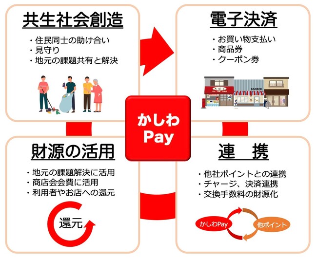 近年、電子マネーが普及してきており、様々な用途や利便性が増してきております。普及と同時に新しい様々な決済手数料が発生しておりますが、かしわPayは独自での運用を行うことで、手数料を最小限にとどめ、さらに得られた財源を地元の課題解決や商店会における活性化補助や、市内かしわPayご利用者様にポイントとして還元させる事によって地元の循環型の経済の活性化を図ることが可能になります。