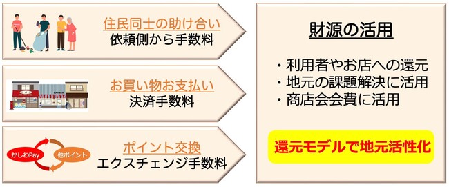 これらのアクションを行う際に発生する、決済手数料やアプリ使用料の一部を、地元に還元や商店会や参加店に還元して行く事で、様々な課題解決や商店会の活性化につなげるための加盟店舗増加を目指します。