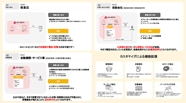 サービス業・小売・飲食店や自治体、保険会社等、あらゆる業種の電話業務ニーズを「AIコールセンター」で代替することが可能です。電話対応業務を自動化したい、顧客接点を強化し売上に繋げたいなど、多様なビジネスニーズにお応えします。「AIコールセンター」では、対話フロー作成代行やカスタマイズによる機能拡張も可能です。