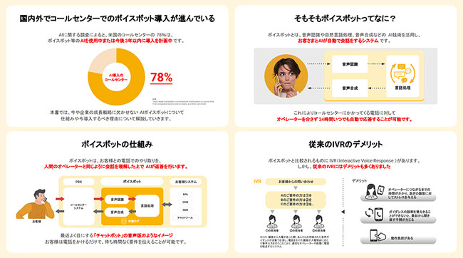 こちらをご覧いただければAIボイスボット導入の可否判断や、進め方が分かる指南書的な資料となっています。