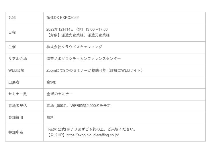 株式会社クラウドスタッフィング(神奈川県横浜市:代表取締役社長 江本亮)は、派遣業界初(※)の「業務・採用・教育」における、最新のDX化のノウハウが学べて体験ができる「派遣DX EXPO2022」を2022年12月14日(水)13時より、御茶ノ水ソラシティカンファレンスセンターにて開催いたします。