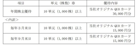 2024年以降、毎年3月末日、9月末日の株主名簿に記載または記録された、当社株式10単元(1,000株)以上を保有する株主様を対象に、以下の通り、当社オリジナルQUOカードを贈呈いたします。