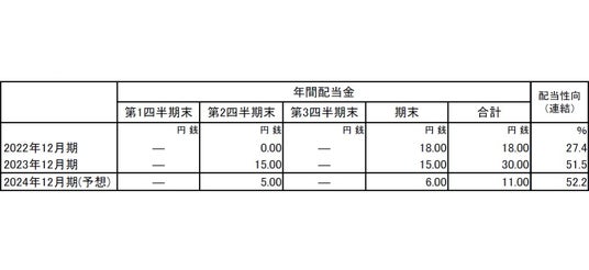 2024年12月期の配当金につきましては、株式分割を考慮した額で、1株当たり11円(中間配当金5円、期末配当金6円)を予想しております。(配当性向52.2%)