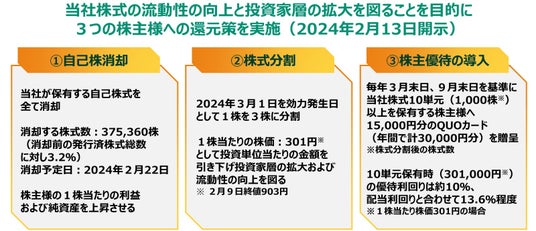 当社は、配当性向50%目安の配当に加え、2024年2月13日開催の取締役会において、自己株式消却、株式分割、株主優待の導入について決議いたしましたので、当社の株主還元策について、ご紹介いたします。