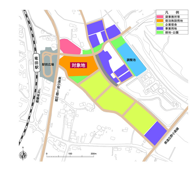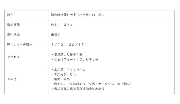 楢葉町では、JR常磐線竜田駅の東側エリアの町有地について、「楢葉町土地利用計画アクションプラン」に基づき、廃炉・除染作業に従事する企業就業者向けの宿舎や長期滞在にも対応できる宿泊施設、就業者等の日常生活をサポートする商業施設の誘致を目指しています。