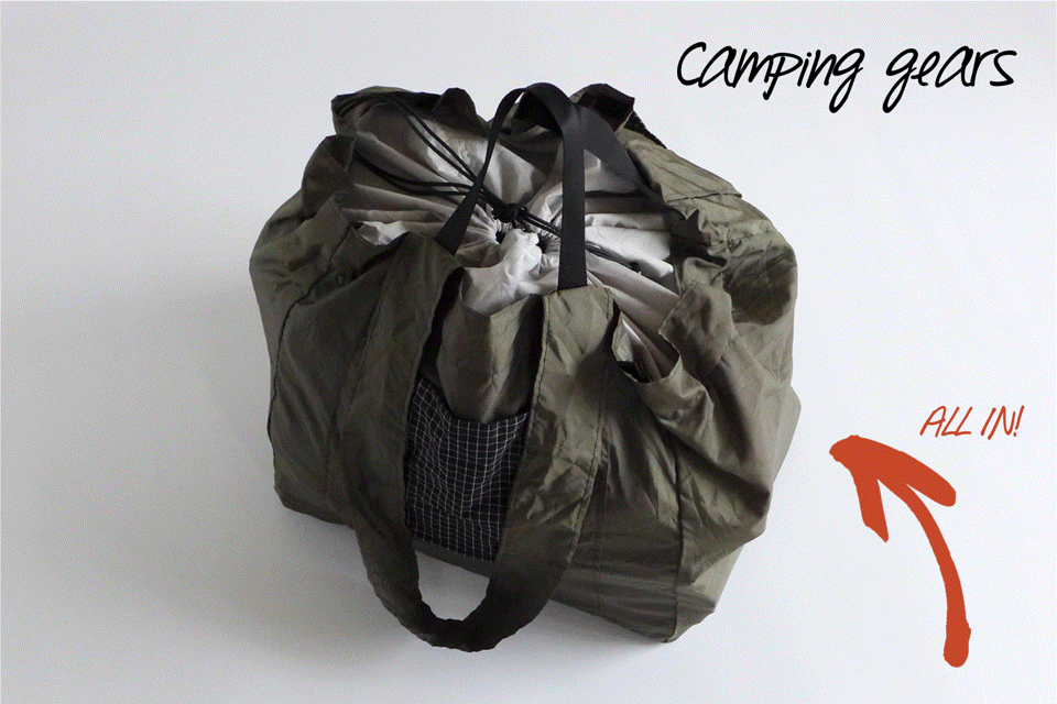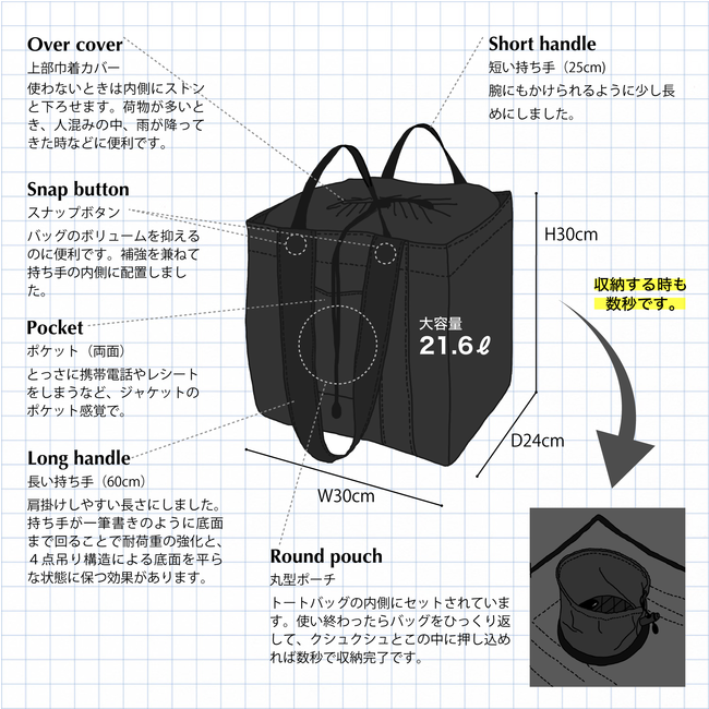 収納時はコンパクトで超軽量(130g)ですが、広げると21.6リットルの大容量トートバッグに変わります。