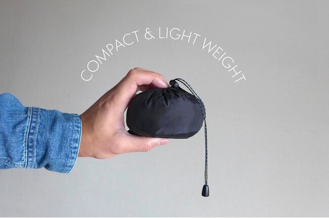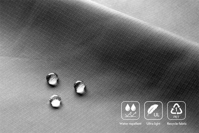 軽量・薄手のリップストップ(格子状に補強の糸が入り高強度で破れにくい生地)で、皺になり難いリサイクル素材を使用しています。