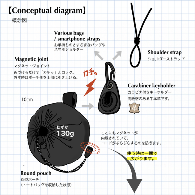 また、付属のキーホルダーは『マグネットジョイント』になっており、「カチッ」と一瞬に着脱できます。お手持ちのバッグやスマホショルダーに取り付けて、好きなスタイルで使用することが出来ます。