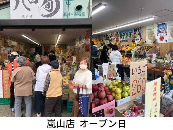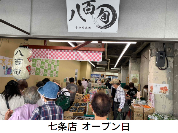 「八百旬」は、2021年7月15日に八百屋として、京都の西大路七条にオープンしました。七条店のオープン日は、売り場面積10数坪ながら、オープン前から大行列で400人を超える方々にご来店いただきました。2022年4月21日には、2号店となる嵐山店がオープンし、売り場面積 約5坪ながら、500人を超える方々にご来店いただき、現在も両店舗ともにおかげ様で大盛況となっております。