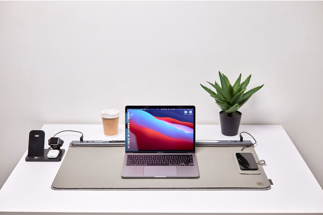 PUレザーマットの左右両側のマグネットに、充電器を固定できます。充電器はQi充電規格なので、iPhoneやAirPodsはもちろん、ほとんどのデバイスに対応しています。充電器は、マットから取り外して持ち運ぶこともできます。