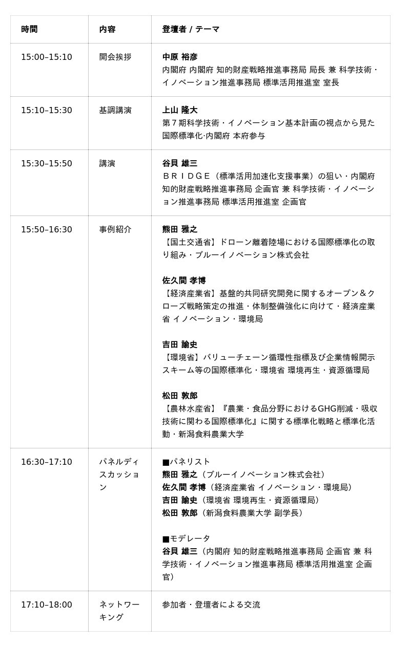 標準化を通じた産業競争力強化や、今後の日本の国際ルール形成戦略について議論します。