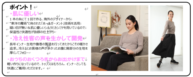インナーにするには高めの価格設定ですが、機能性・快適性・実用性を追求した「温活ニット」は使い勝手がよく、冬の多くの機会で使い回せます。