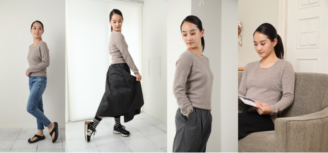 肌に優しい、シルクとカシミヤを用い、海外のデザイナーから“東洋の魔術”と称された「ホールガーメント」技術を活用した肌に優しい、あったかニット。さらに同技術により、糸のロスが0となりCO2削減とSDGsに寄与。