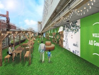旧そごう本館跡地1Fにオープンする「All Good Garden」は、多くの人たちの憩いの場所となるように、パーゴラやソファなど多彩なファニチャーを設置します。地面には人工芝を敷き詰め、旧そごう柏店本館の壁はグリーンをモチーフにしたウォール造作物やアートを設置し、JR線路側のフェンス沿いには植栽を活用したデコレーションを設置します。