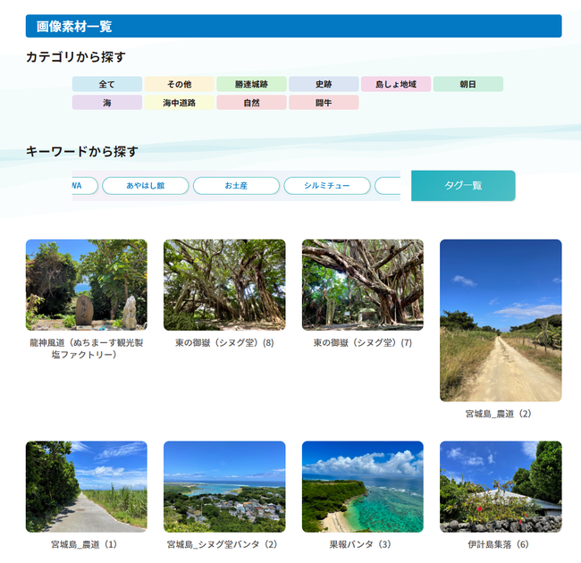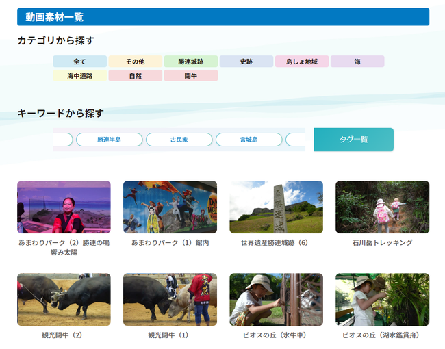 画像や動画の種類は、うるま市の島しょ地域(浜比嘉島、平安座島、宮城島、伊計島、津堅島)や世界遺産勝連城跡、闘牛、観光スポットなど豊富に揃えており、カテゴリやタグで素材を探すことが可能です。