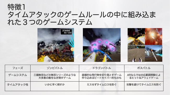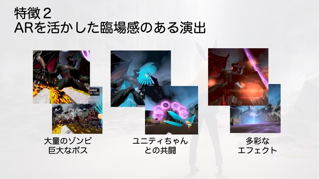 大量のゾンビや巨大なボスキャラクター、ユニティちゃんとの共闘などは、ARで広範囲の移動が可能になることにより、VRを超えた臨場感を演出しています。