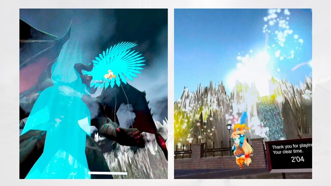 三つ目は、ボスとのバトルフェーズで、プレイ動画中では、攻撃を受けて武器が後方に吹き飛ばされていますが、ボスの攻撃は、一定範囲に当たり判定があり、唸り声やモーションを合図に、ボスから離れることで、攻撃を避けてタイムロスを防ぐことができる作りになっています。このように実際にプレイヤーが広範囲を移動してヒット&アウェイで戦うゲームシステムは、ARならではの体験でもあります。