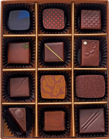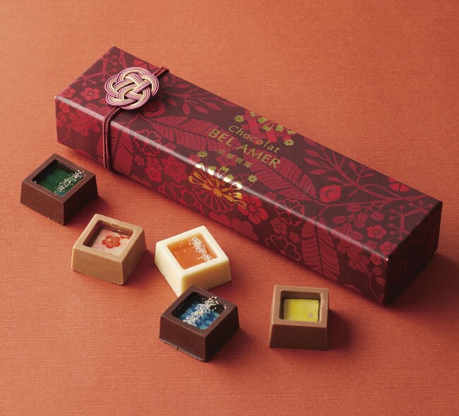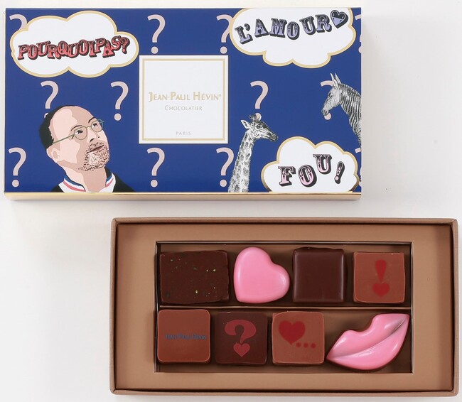 期間限定のショコラ5個を含むボンボンショコラ8個の詰め合わせ。今季のテーマ「Pourquoi pas?(こんなのがあってもよいのでは?)」の通り、愛やショコラへの「想像が膨らむ様子」を表現したスリーブ付きです。