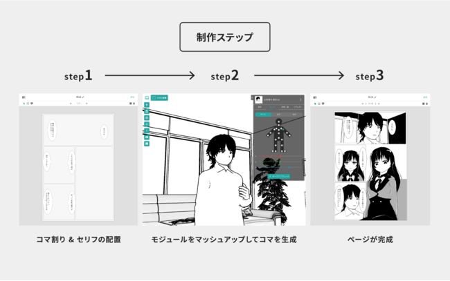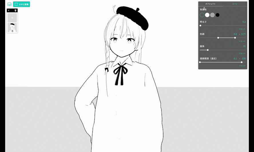背景や漫符なども配置し、カメラを操作して任意の角度から3D空間をキャプチャすることで、簡単にコマを生成できます。