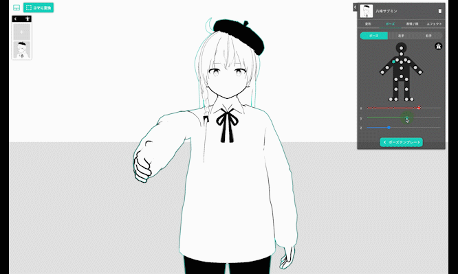 素材の変形には様々な機能が用意されています。例えばキャラクターの表情やポージングはパラメーターを編集して調整するだけで無限のバリエーションを生み出すことが可能です。