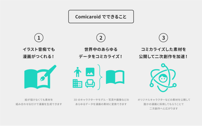 Comicaroidは世界中のあらゆるデータを漫画で利用可能な素材に変換し、それらを直感的な操作で組み合わせることにより、誰もが漫画をマッシュアップすることができるプラットフォームです。