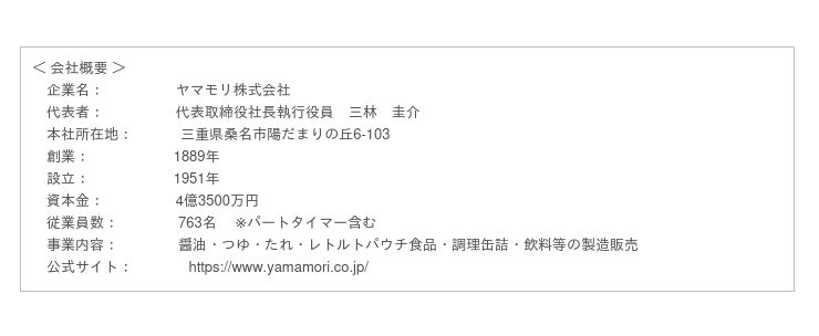 ヤマモリは、今後も企業努力を続けながら、お客様のニーズに応える安心・安全で高品質な商品をお届けするように、取り組んで参ります。