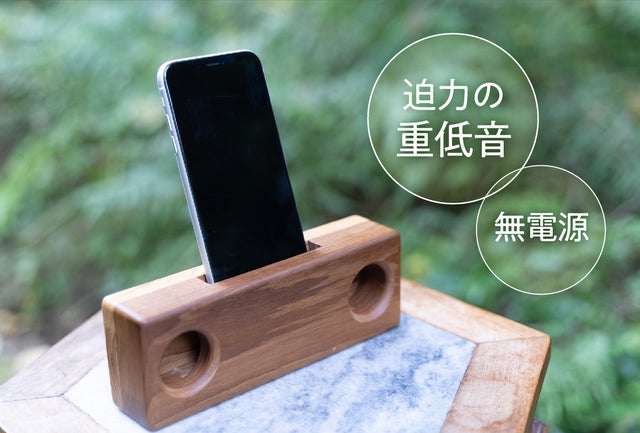 『WOOD SPEAKER』はスピーカーにセットしたスマホから出力されるサウンドをスピーカー内で増幅させて音を出す仕組み。スマホを置くだけで音量がアップする、スイッチも充電も必要ないスピーカーです。
