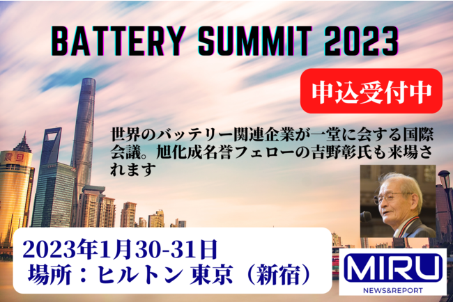 2023年1月30日(月)31日(火)にIRuniverse株式会社運営の総合資源の情報メディアMIRU.com主催のリアル国際会議&ビジネス交流会『BatterySummit2023』をヒルトン東京にて開催いたしますことをお知らせいたします。